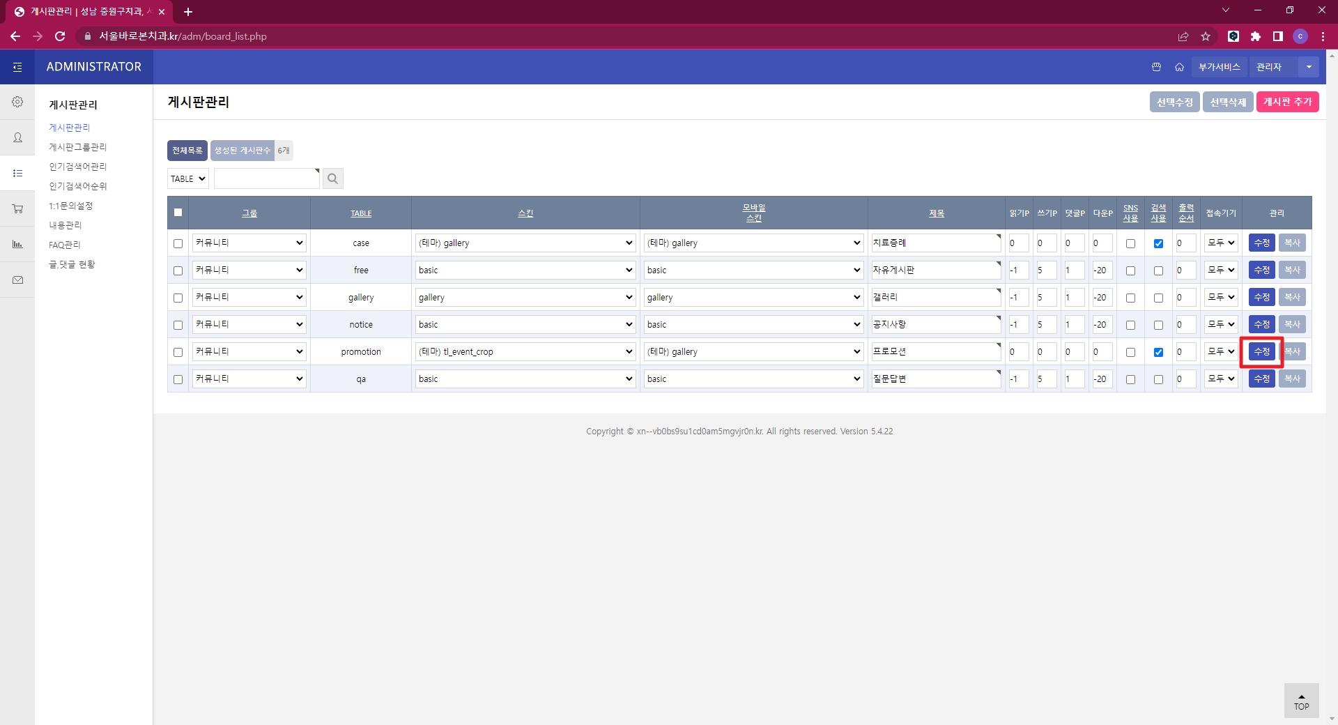 관리자메뉴의 게시판 리스트에서 수정 버튼을 클릭해서 환경설정 메뉴로 진입할 수 있습니다.