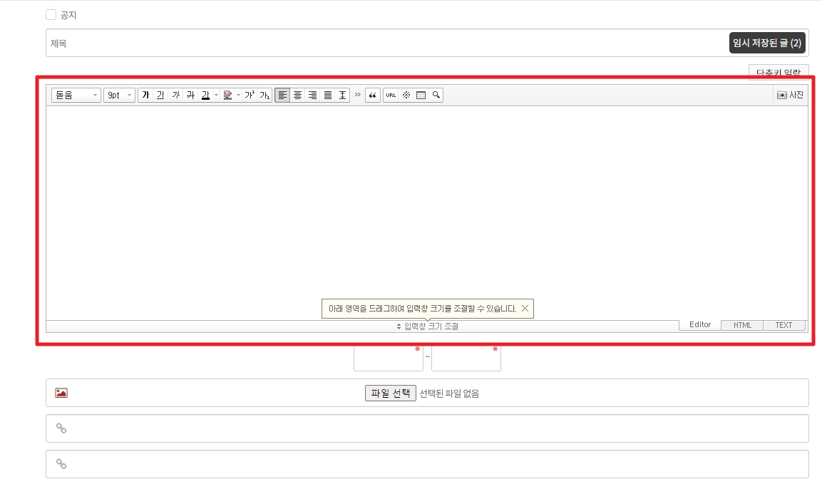 게시판에 글쓰기를 할 때 에디터가 보이지 않을 때는 아래 곳을 체크해보세요