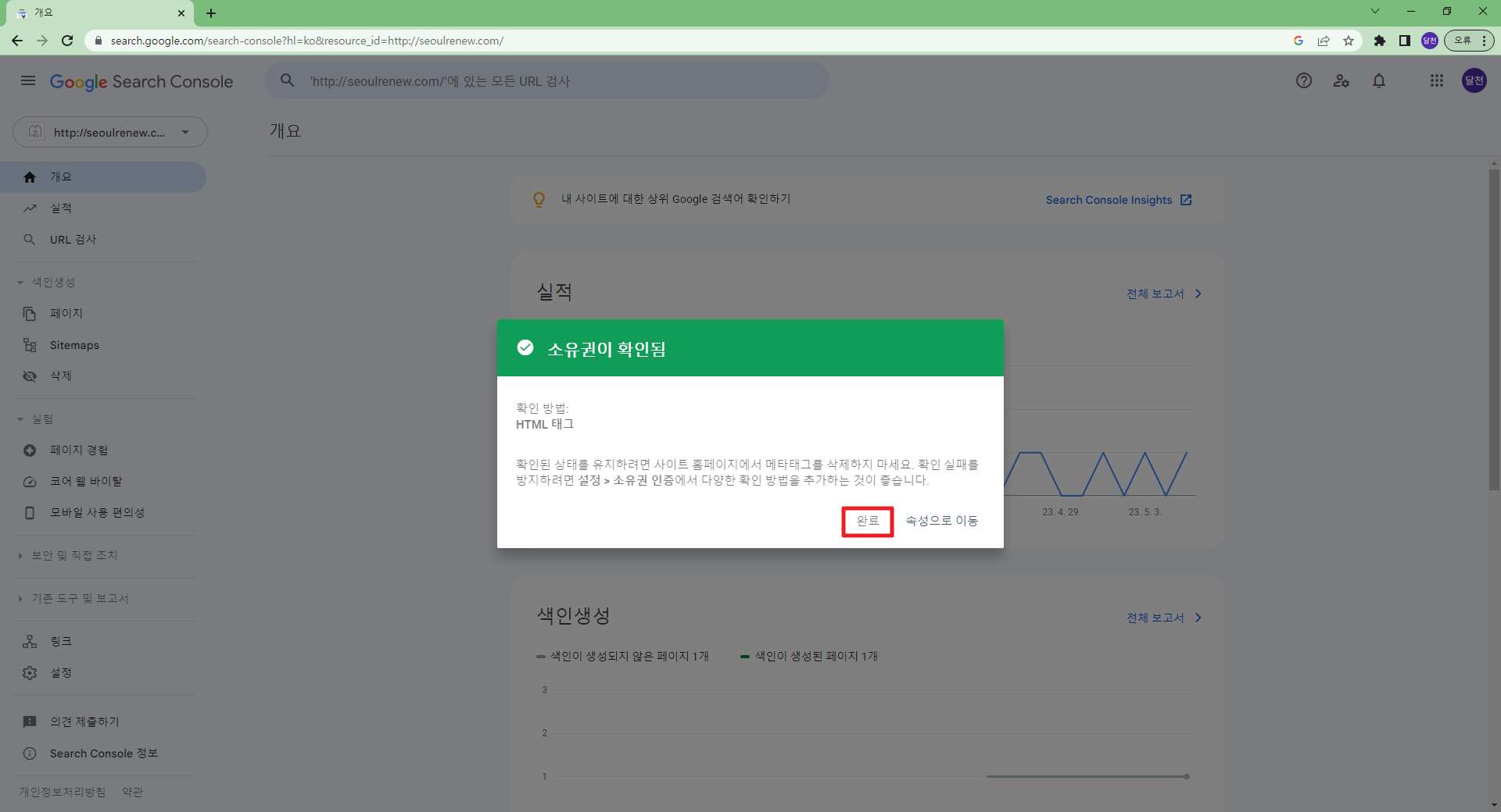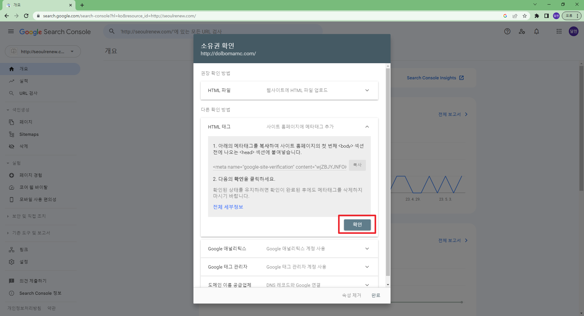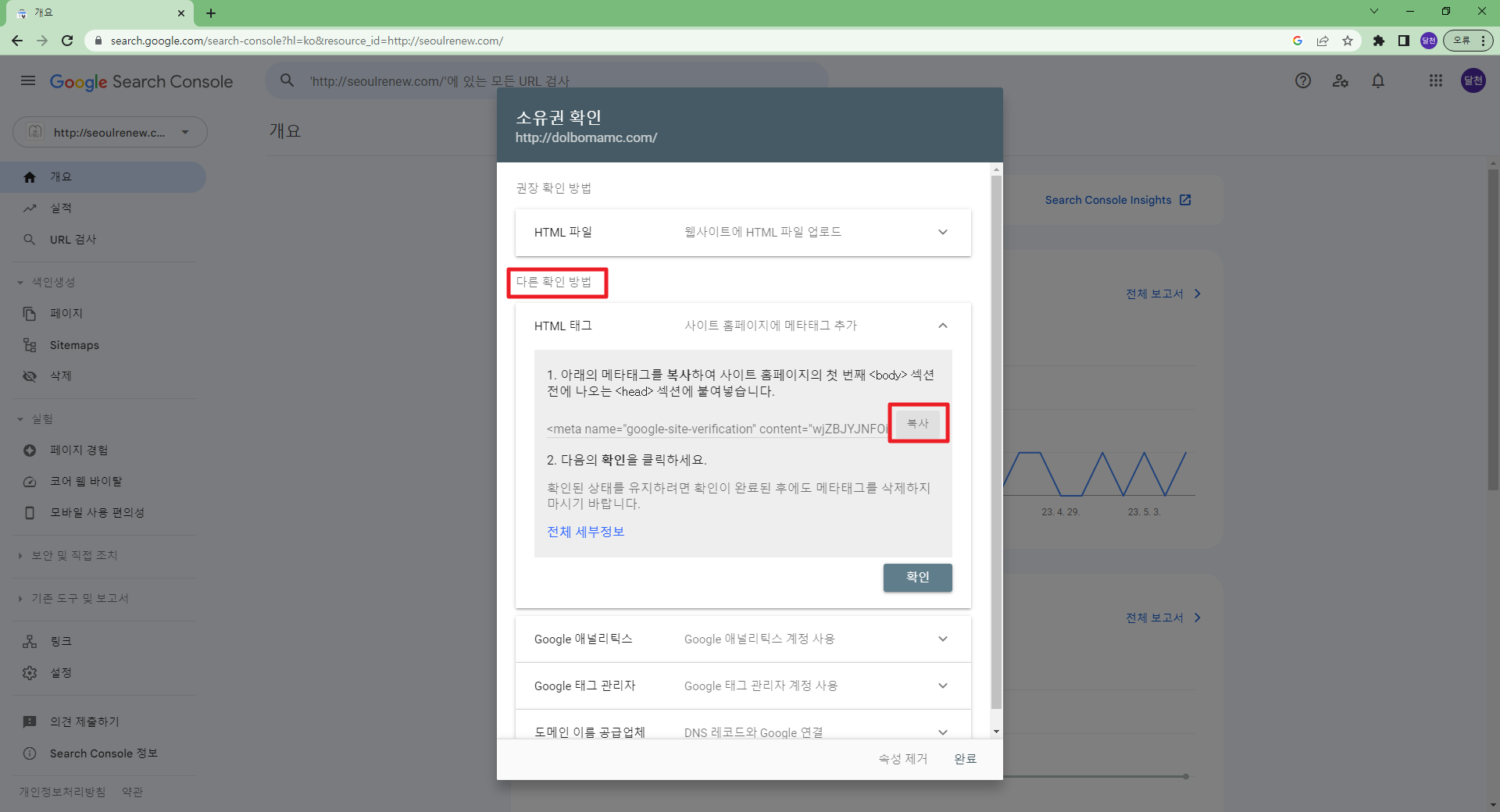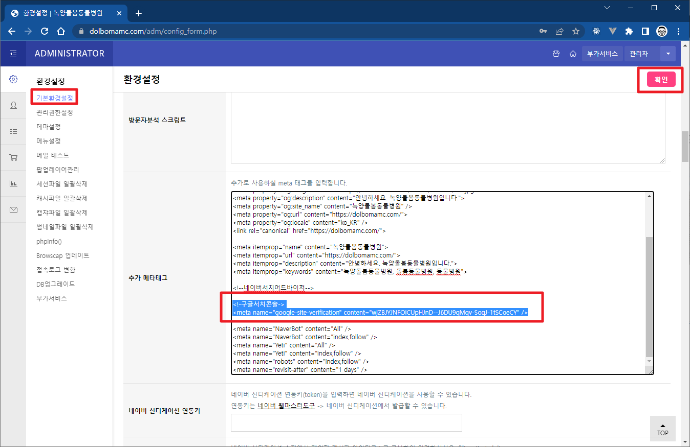 구글에서 구글서치콘솔을 검색하면 해당사이트로 이동 가능 구글서치콘솔 (구글 웹마스터도구) https://search.google.com/search-console?hl=ko 홈페이지에 구글 웹마스터도구를 등록하기 위해서는 반드시 구글 계정이 반드시 필요합니다. 보통 클라이언트의 구글 계정을 사용합니다. 코드를 복사하고 해당 사이트의 관리자로 이동합니다. 그림과 같이 관리자화면에서 해당 코드를 복사해서 붙인 후 완료를 클릭해서 코드값을 저장합니다. 저장을 한 후 확인 버튼을 클릭해서 정상적으로 입력되었는지 구글에서 검증을 합니다. 사이트에 코드값을 넣지 않고 확인 버튼을 클릭하면 에러가 발생하니 순서를 주의해주세요