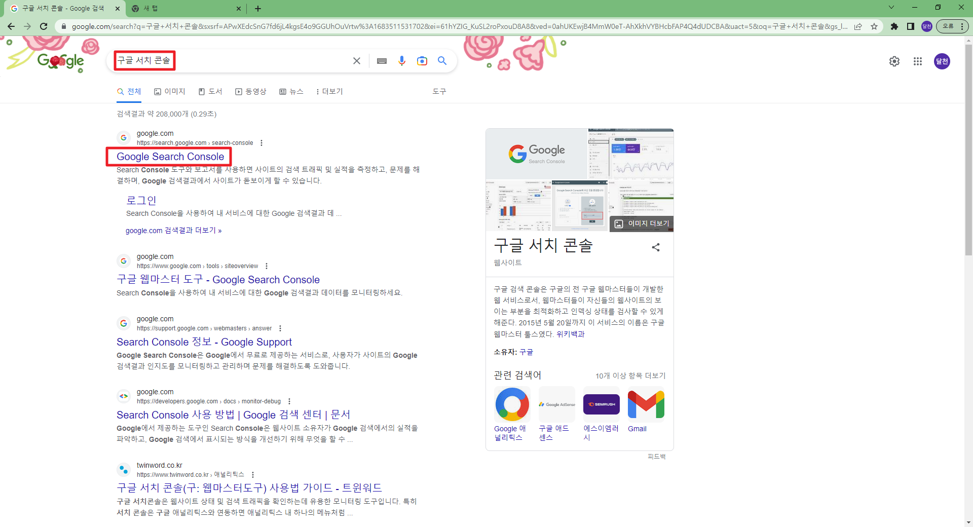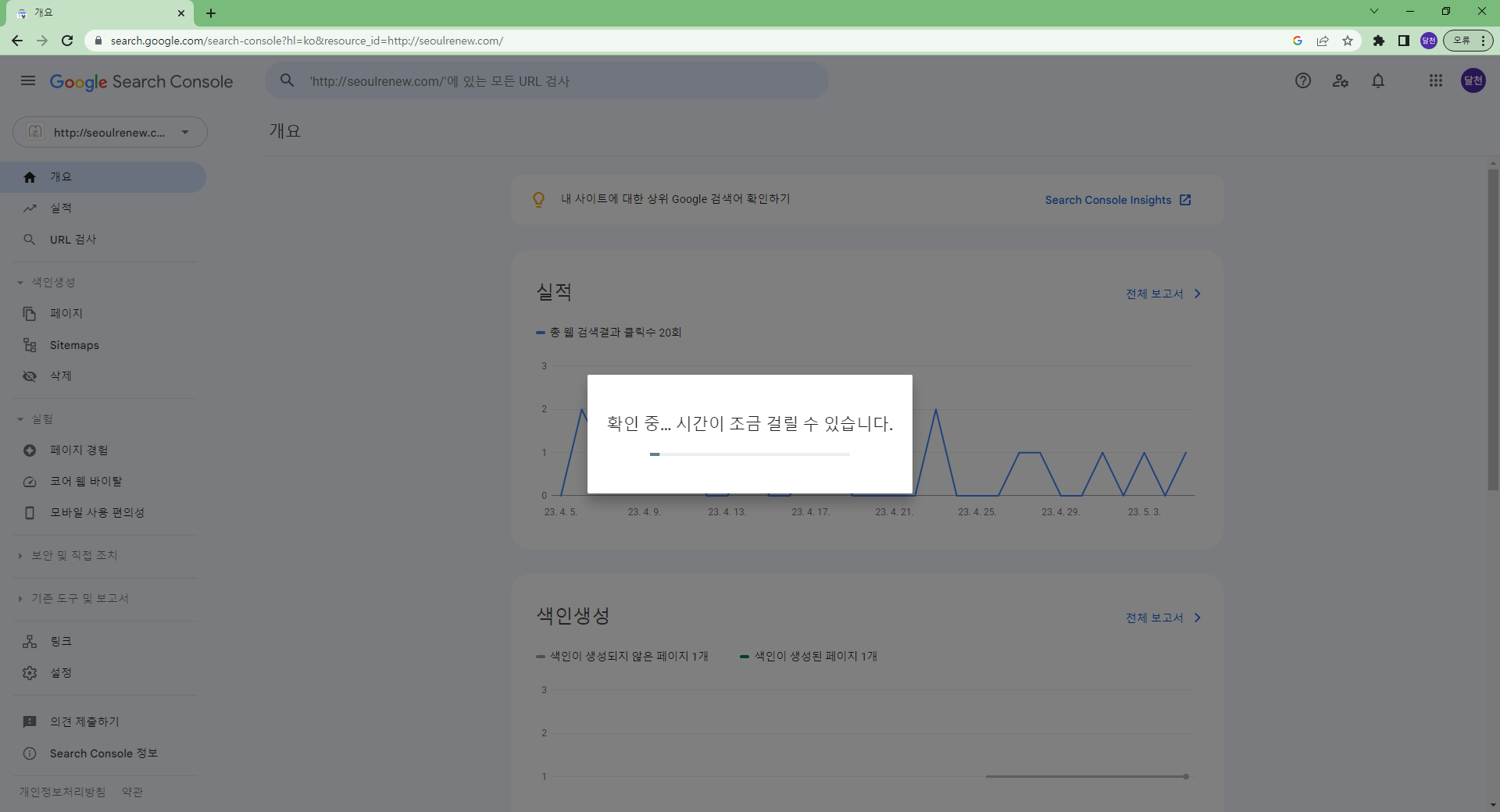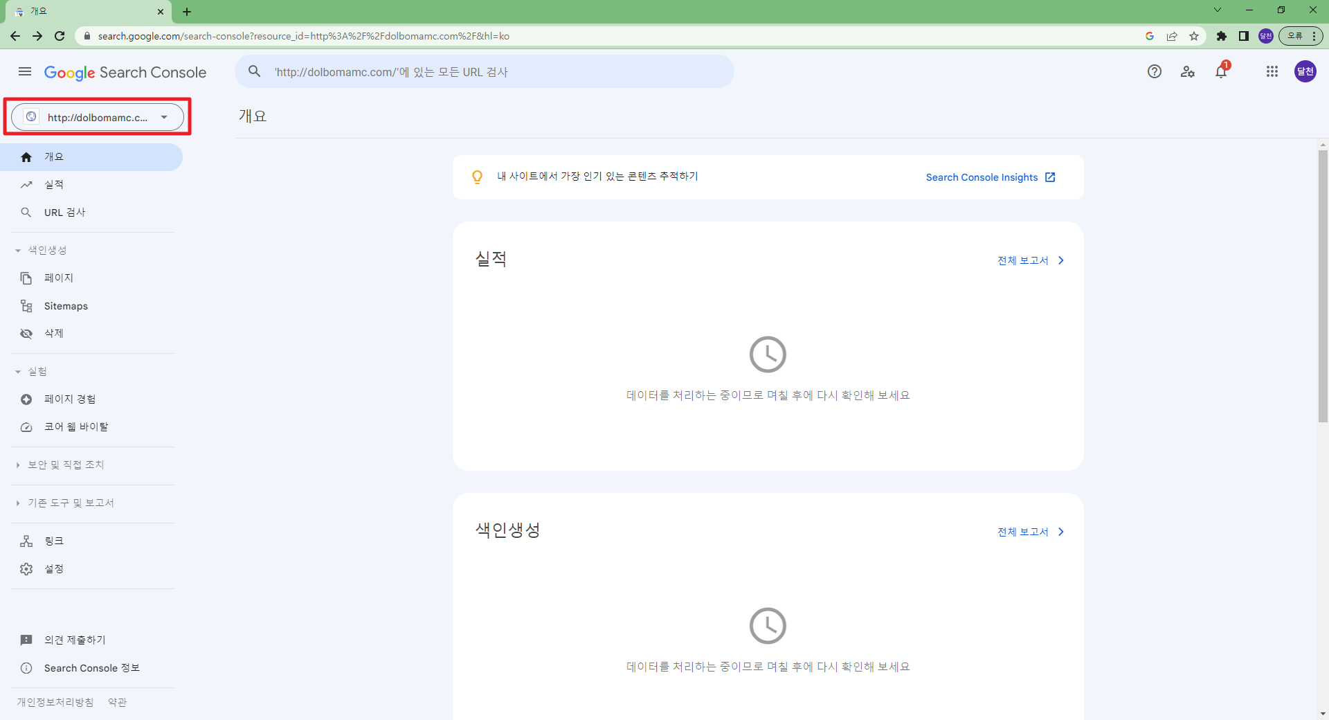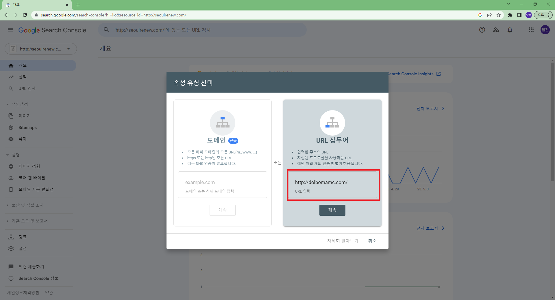 구글에서 구글서치콘솔을 검색하면 해당사이트로 이동 가능 구글서치콘솔 (구글 웹마스터도구) https://search.google.com/search-console?hl=ko 홈페이지에 구글 웹마스터도구를 등록하기 위해서는 반드시 구글 계정이 반드시 필요합니다. 보통 클라이언트의 구글 계정을 사용합니다. 코드를 복사하고 해당 사이트의 관리자로 이동합니다. 그림과 같이 관리자화면에서 해당 코드를 복사해서 붙인 후 완료를 클릭해서 코드값을 저장합니다. 저장을 한 후 확인 버튼을 클릭해서 정상적으로 입력되었는지 구글에서 검증을 합니다. 사이트에 코드값을 넣지 않고 확인 버튼을 클릭하면 에러가 발생하니 순서를 주의해주세요