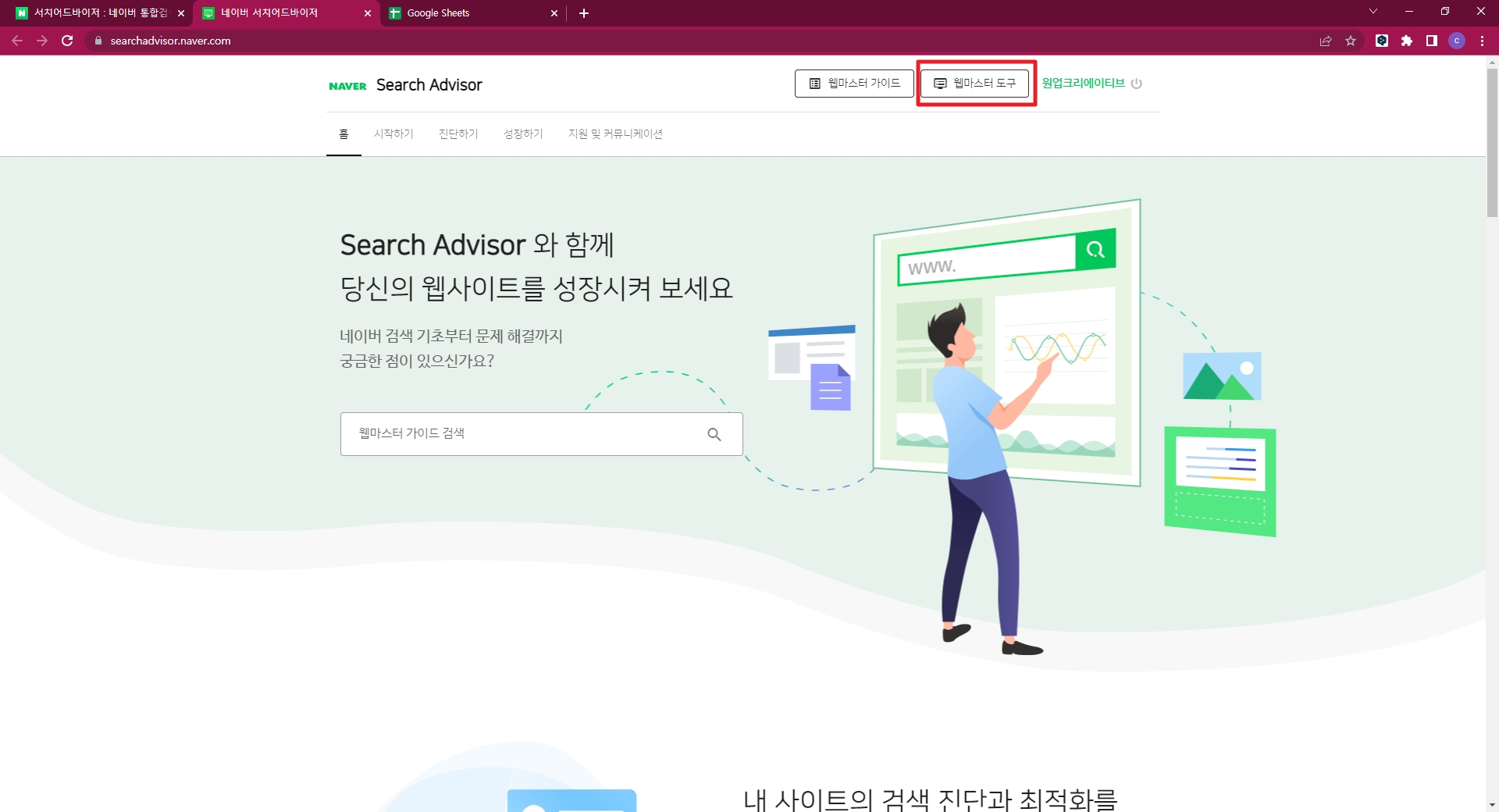 네이버에서 서치어드바이저 (구, 웹마스터도구) 사이트로 접속합니다.