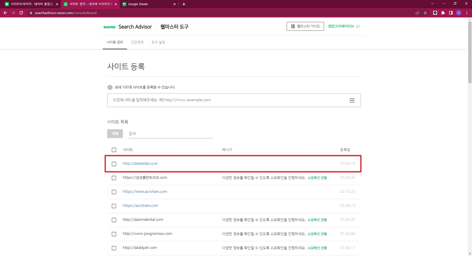 등록하기전에 미리 간단체크를 통해서 사이트를  미리 등록되어 있는지 여부를 확인해볼 수 있으며
