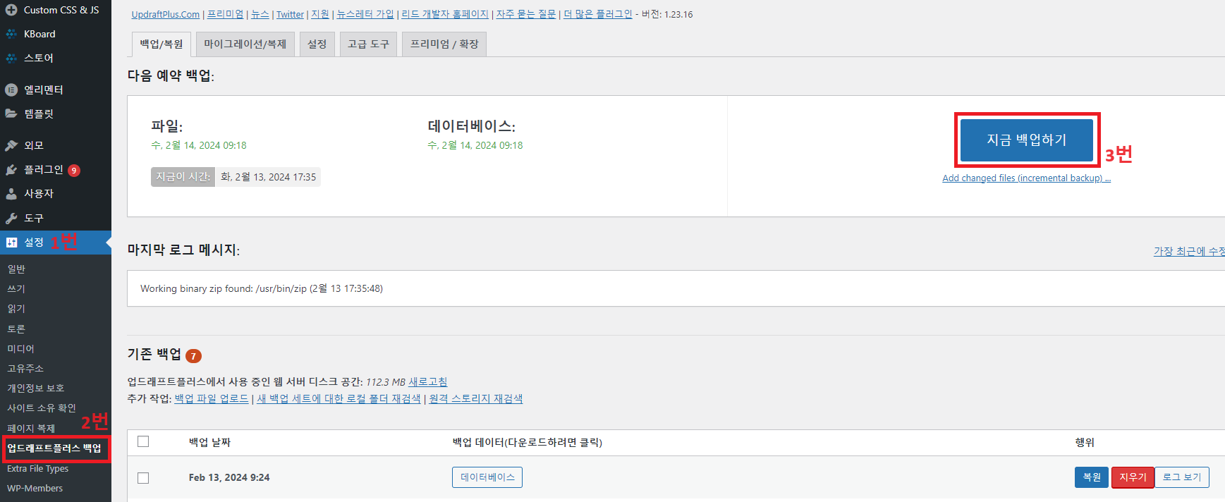 1.  관리자 페이지 > 설정 > 업드래프플러스 백업 > 지금 백업하기