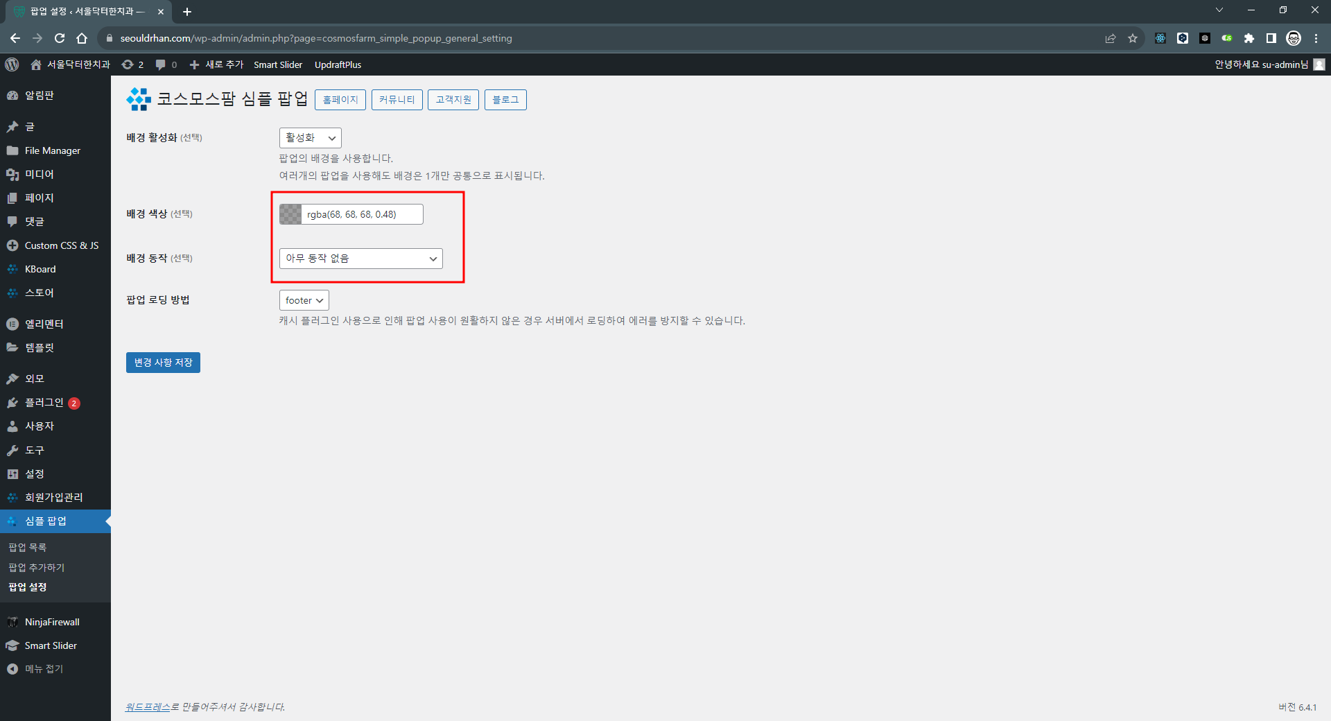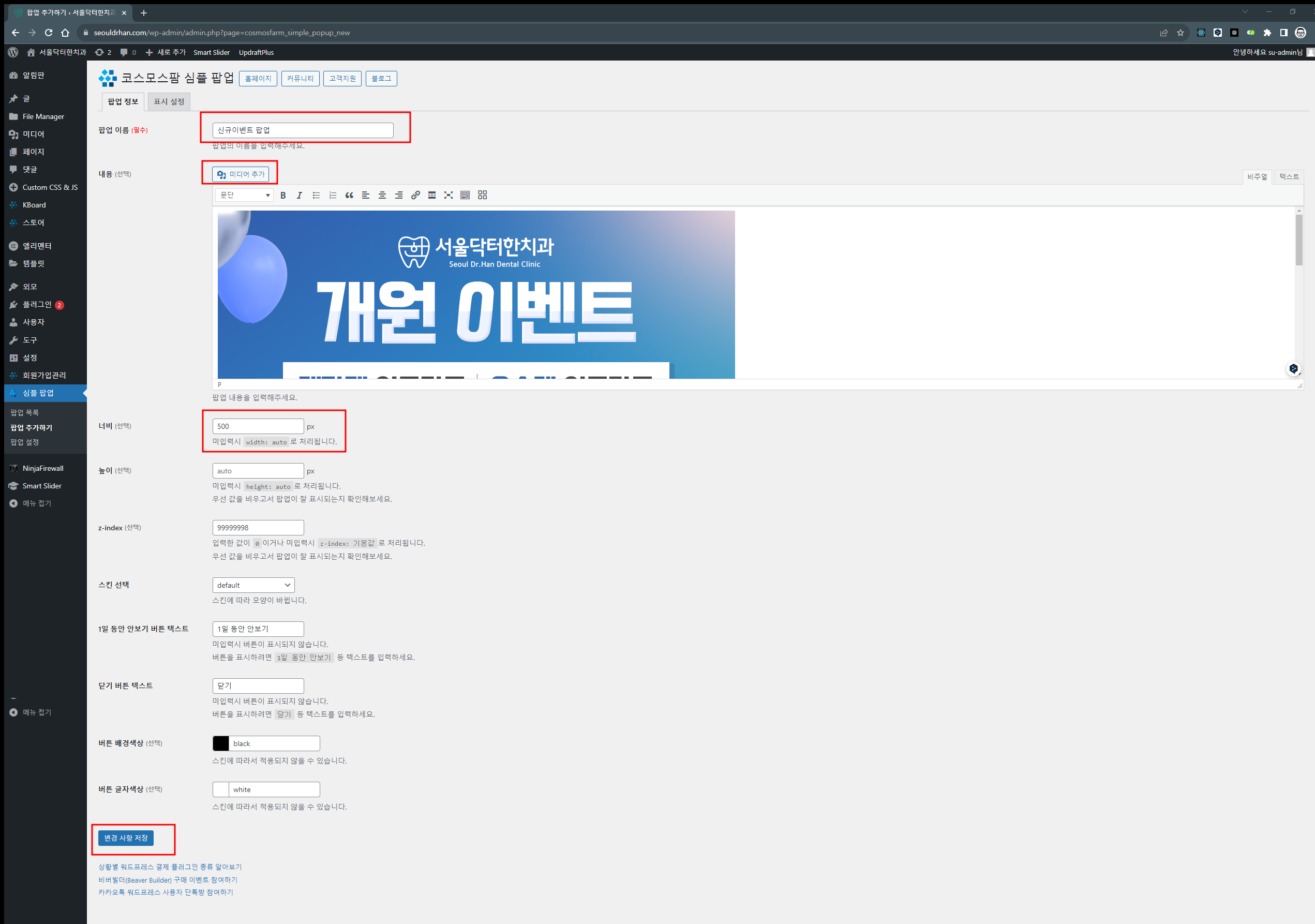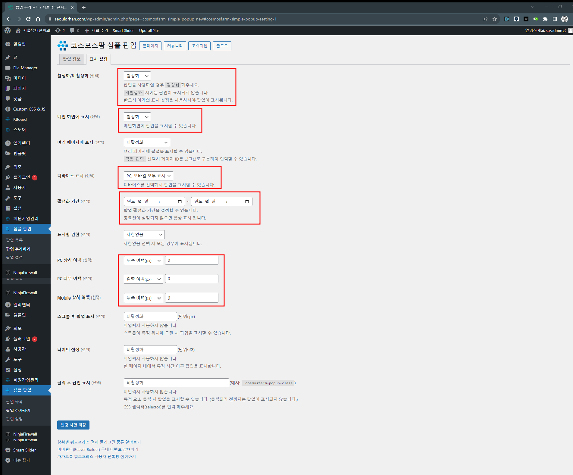 - 활성화/비활성화로 팝업을 사용여부를 결정할 수 있으며 메인화면에 표시를 체크를 반드시 해야합니다.